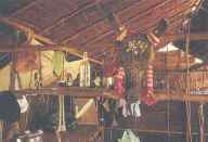 หมอวัวกำลังนั่งทำพิธีทางไสยศาสตร์อยู่บนแคร่พิธี ซึ่งมีดอกไม้ ธูป เทียน และผ้ายันต์ |