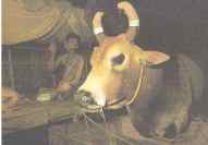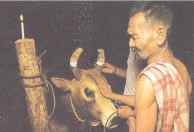 หมอวัวกำลังท่องคาถาอาคม และเขียนอักชระขอมบนหน้าวัว เพื่อคุ้มกันภัยให้ให้มีชัย |