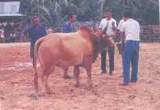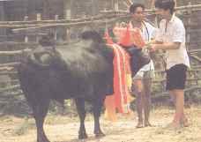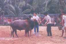 คนเลี้ยงวัวชนกำลังจับเหลียะ เตรียมพร้อมที่จะปล่อยวัวเข้าชนกันหลังจากทำพิธีทางไสยศาสตร์ และแต่งวัวเรียบร้อยแล้ว |