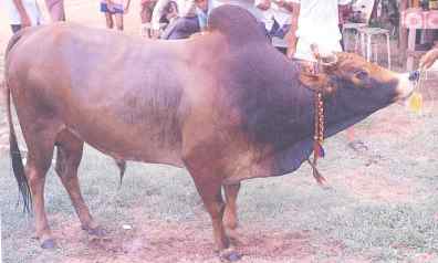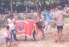 วัวชนจะได้รับการตกแต่งประดับประดาอย่างสวยงาม แล้วแห่แหนออกจากสนาม |